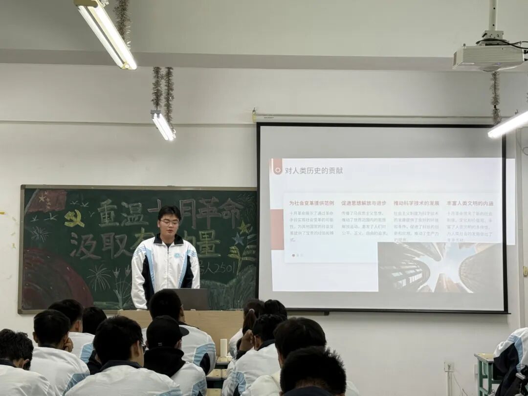 在理论学习后,各班集中观看了十月革命主题纪录片。屏幕上,革命者们冒着枪林弹雨冲锋的身影、苏维埃政权建立时的庄严时刻,将书本中抽象的历史转化为具象的感动。观影结束后,同学们纷纷表示,革命先驱的影像让他们对历史与今天血脉相连有了更深刻的体悟。大家一致认为,十月革命作为“红色源头”,其精神与中国共产党的成长历程紧密交织,只有读懂这段历史,才能倍加珍惜当下的幸福生活。