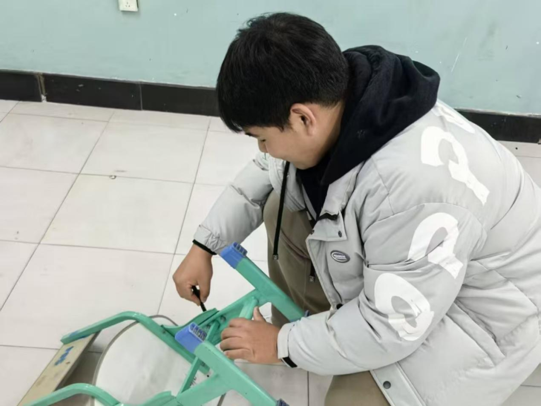 维修当天,学生干部们带着扳手、螺丝刀、胶水等工具早早来到教室。现场迅速分工,有的负责拧螺丝加固松动的桌椅,有的用胶水修补桌面的裂缝。遇到螺丝滑丝、桌腿变形这类复杂问题时,大家围坐在一起讨论解决方案,有人提议用钳子辅助拧出滑丝的螺丝,有人想到用木板垫在桌腿下调整平衡,在你一言我一语的协作中,一个个难题被逐步攻克。