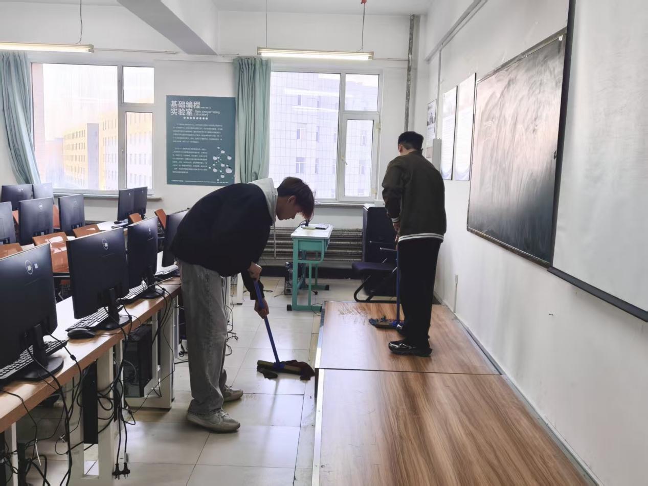 随后,学生干部们深入学院机房,对机房内的桌面、地面、设备缝隙进行全方位清扫,细致清理灰尘杂物,排查环境安全隐患,保障教学实训空间的整洁有序。大家用细致入微的行动,守护学院的整洁风貌,为全院师生筑牢安全、舒心的学院环境防线。