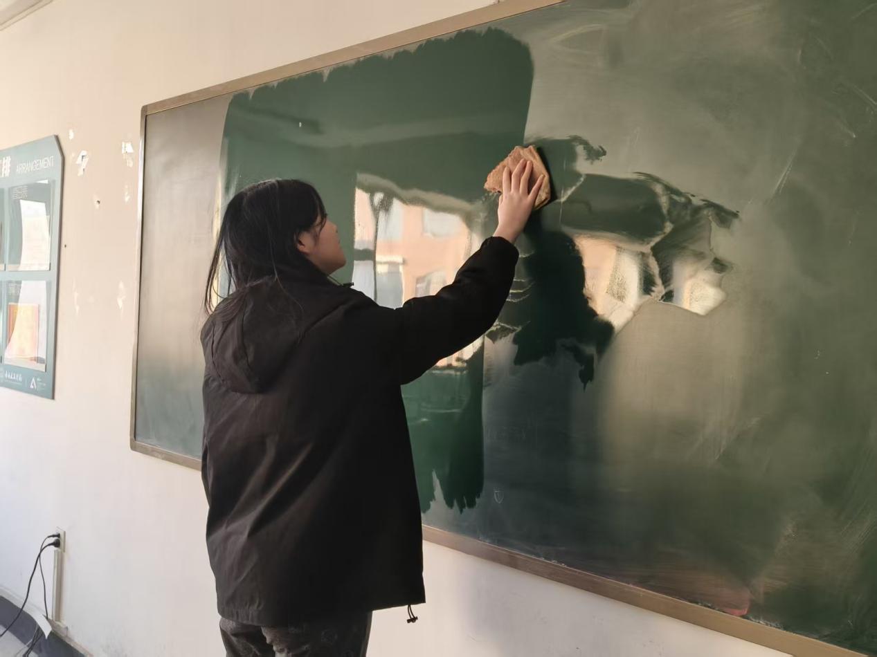 活动伊始,学生干部们在学院楼前整齐集结,明确分工后迅速投入到各项清洁工作中,以“不留死角、全面焕新”为目标,让学院环境整治行动全面启动。在教学区域,同学们对楼层公共空间展开细致排查,重点清理了易被忽略的角落,并对教室黑板进行彻底擦拭,清除板书残留与污渍,让每一块黑板都洁净如新,为课堂教学营造清爽环境。同时,针对班级内外过期海报与不规范张贴物,大家逐一清理撕除,仔细铲除残留胶印,还原墙面整洁风貌。此外,学生干部也深入各楼层卫生间,对内部环境进行系统清洁,移除各类残留张贴物,确保这些高频使用的公共空间同样保持干净、整洁。